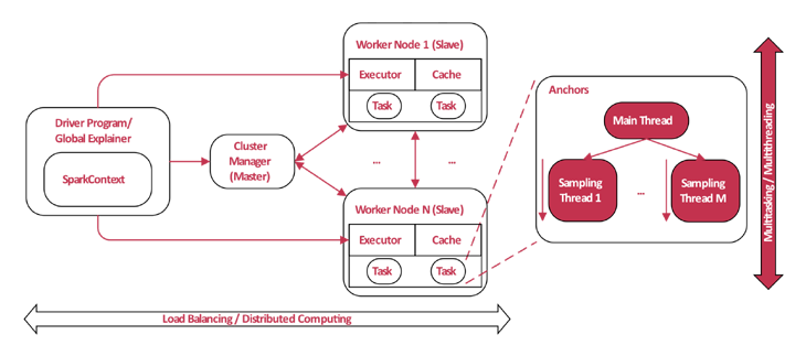 Für die globale Erklärung muss jede Instanz des Datensatzes erklärt werden, bevor die Auswahl der Repräsentanten stattfinden kann. Da dies bei einem Pool von vielen Tausend Datensätzen die Laufzeit um genau diesen Faktor erhöht, wurde es als sinnvoll betrachtet, die Berechnung einer Erklärung pro Datensatz als einen Job anzusehen und diesen an verschiedene Ausführungsorte zu verteilen. Dazu wurde eine Verteilung mittels Apache Spark entwickelt. Dabei werden alle benötigten Bibliotheken in den Spark-Kontext geladen und anschließend alle Instanzen weitergegeben. Spark erstellt zu jeder Instanz einen Job und verteilt diese an die einzelnen Worker-Nodes. Nach Berechnung einer Anchors-Erklärung wird das Ergebnis zurück an den Aufrufer gesendet.